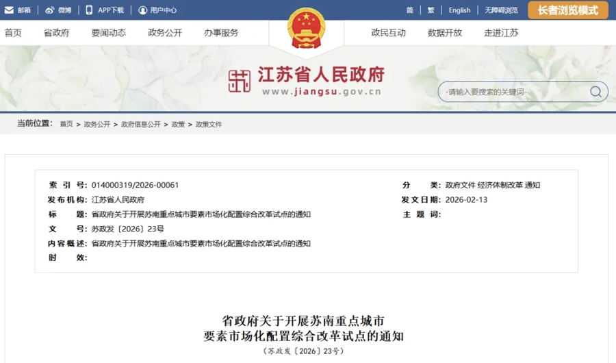 近日,江苏省人民政府网站发布《省政府关于开展苏南重点城市要素市场化配置综合改革试点的通知》。全文如下: