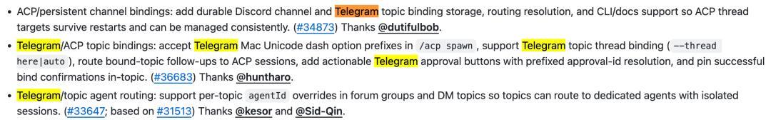 Discord端修复了断连后无法恢复的死机问题,优化了频道解析和机器人心跳检测。Telegram端新增了主题级别(Topic)的智能体路由隔离——这意味着你可以在同一个Telegram群组的不同主题里,分别运行不同的AI智能体,互不干扰。