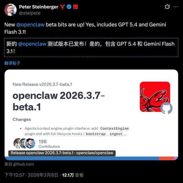就在刚刚,OpenClaw官方发布了全新v2026.3.7-beta.1版本,创始人Peter Steinberger亲自下场在X上高调官宣。
