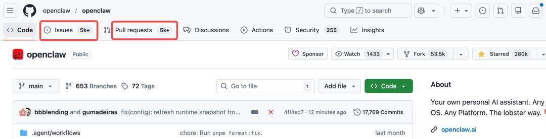 顺带一提,OpenClaw不仅Star数狂飙冲向3w+,而且issues和pr数量也是冠绝全球。
