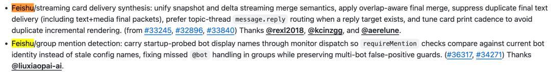 渠道层面,覆盖了Telegram草稿流重复、Discord断连死机、Slack消息路由、飞书Webhook兼容性、WhatsApp自聊天前缀注入、iOS/macOS端的各种边界情况。